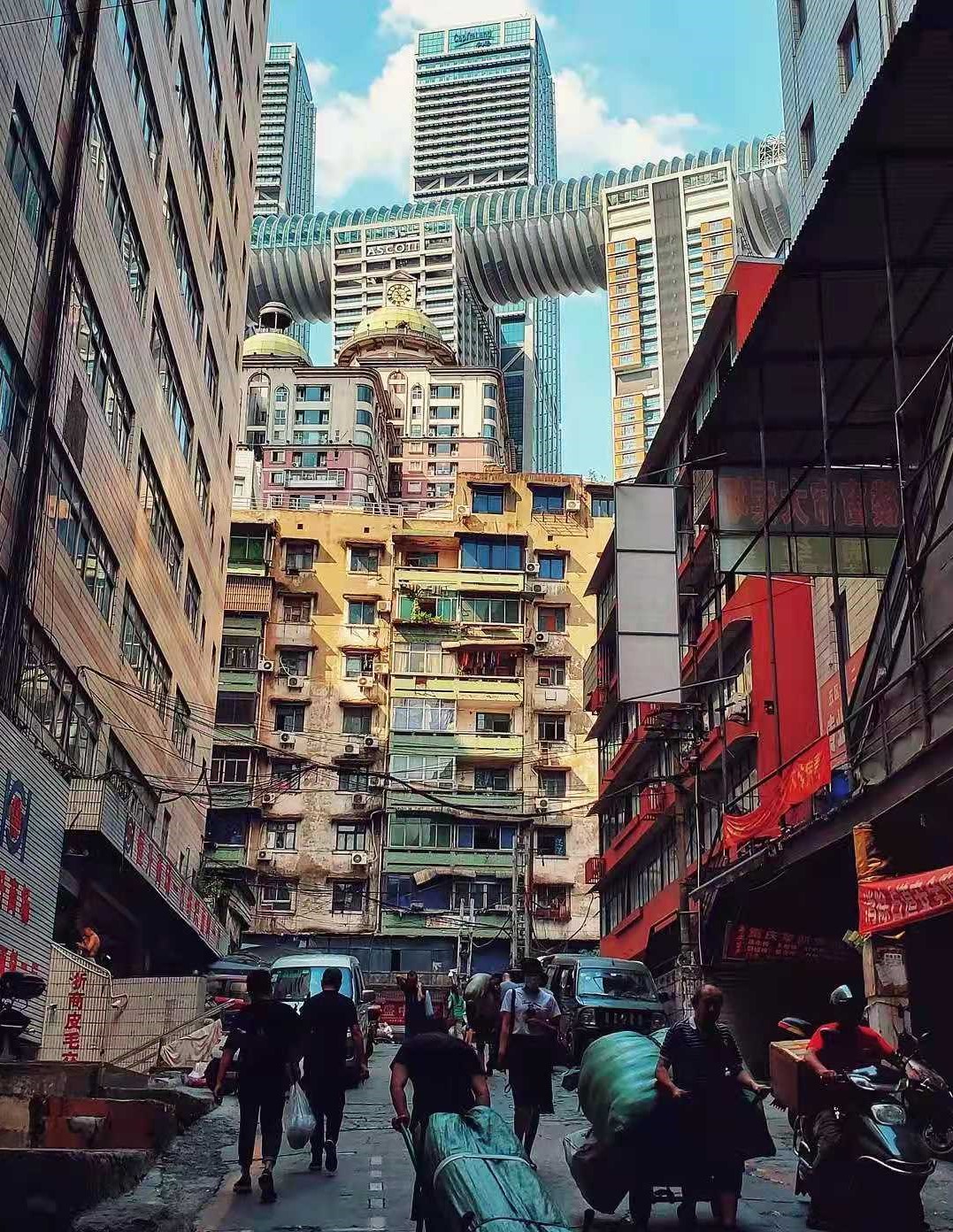 高低起伏的城市天際線,立體化交通和特色建築帶來的空間錯亂,讓重慶具備了賽博朋克視覺印象的硬件基礎。在形態各異的現代混凝土巨獸陰影下,穿行於錯綜複雜的大街小巷,再生出一絲混亂、迷茫的情緒,可不就是有幾分賽博朋克?