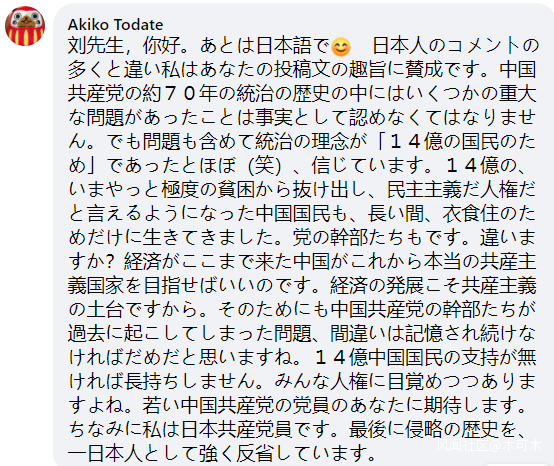 譯文:【劉先生,你好。剩下的是日語😊 和大多數日本人的評論不同,我同意你發帖的內容。 必須承認的事實是,在70年左右的執政史上,存在着一些問題,我幾乎相信的(笑),治國理念包括“為了14億人”,14億中國人終於走出了極端貧困,現在可以談民主和人權了,但長期以來,他們的生活只是為了衣食住行。黨的領導人也是如此。不是嗎? 中國經濟走到這一步,從現在開始,中國的目標應該是成為一個真正的共產主義國家。發展經濟是共產主義的基礎。 沒有14億中國人民的支持,是不會長久的。人們的人權意識越來越強了,不是嗎?我對你這個年輕的中國共產黨員寄予厚望。對了,我是日本共產黨員。 最後,我對作為日本人的侵略歷史表示強烈的遺憾。】