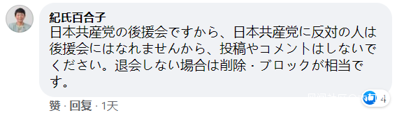 譯文:【因為這裏是日本共產黨黨的後援會羣,反對日共的人不能加入這裏,所以請不要發帖或評論。如果你不離開這裏,我們就會刪除或屏蔽你。】
