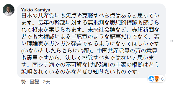 譯文:【我認為,日本共產黨有自己的缺點和需要克服的地方。有一種長期以來對領導者在意識形態上不加批判便奉為圭臬,這讓我對未來感到擔憂。我希望年輕的理論家們能夠暢所欲言,不僅僅是像《赤旗報》上的那些關於未來社會的文章,這些文章似乎是權威的神諭(如果沒有的話,我就更擔心了)。中共黨員的意見也是很有價值的,我認為不應該排斥他們。 我很想知道他們如何解釋南海莫名其妙的 “九段線 “主張的依據。】