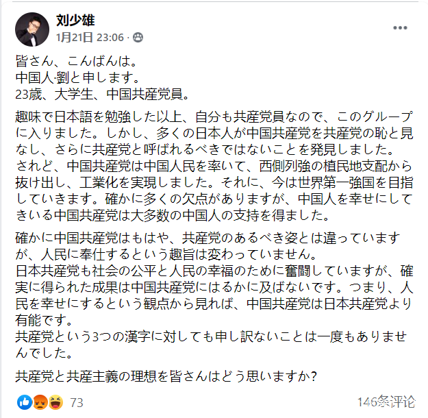 事情是這樣的,有一位自稱23歲是大學生也是中共黨員的小夥子,在FB的封閉羣組【日本共産黨Facebook後援會】(類似於支援選舉的團體?)中發帖留言,表示自己對日語感興趣學了一點日語,但是發現很多日本人對我黨有什麼誤解,我黨在幾十年間取得了巨大的成就,我黨比你黨厲害多了,你們對得起共產黨這幾個字嗎云云。