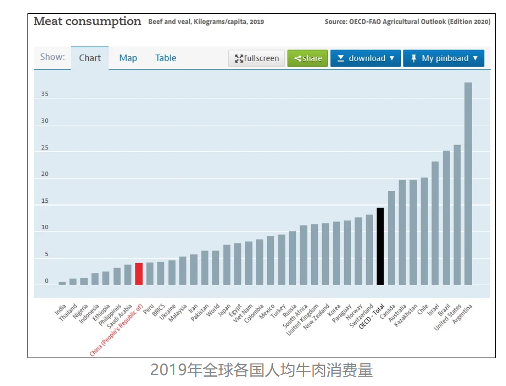 根據經合組織2019年的分類數據,中國人均牛肉消費僅為4.1公斤,且不説低於世界平均水平,更遠低於阿根廷的38公斤和美國的26.3公斤。