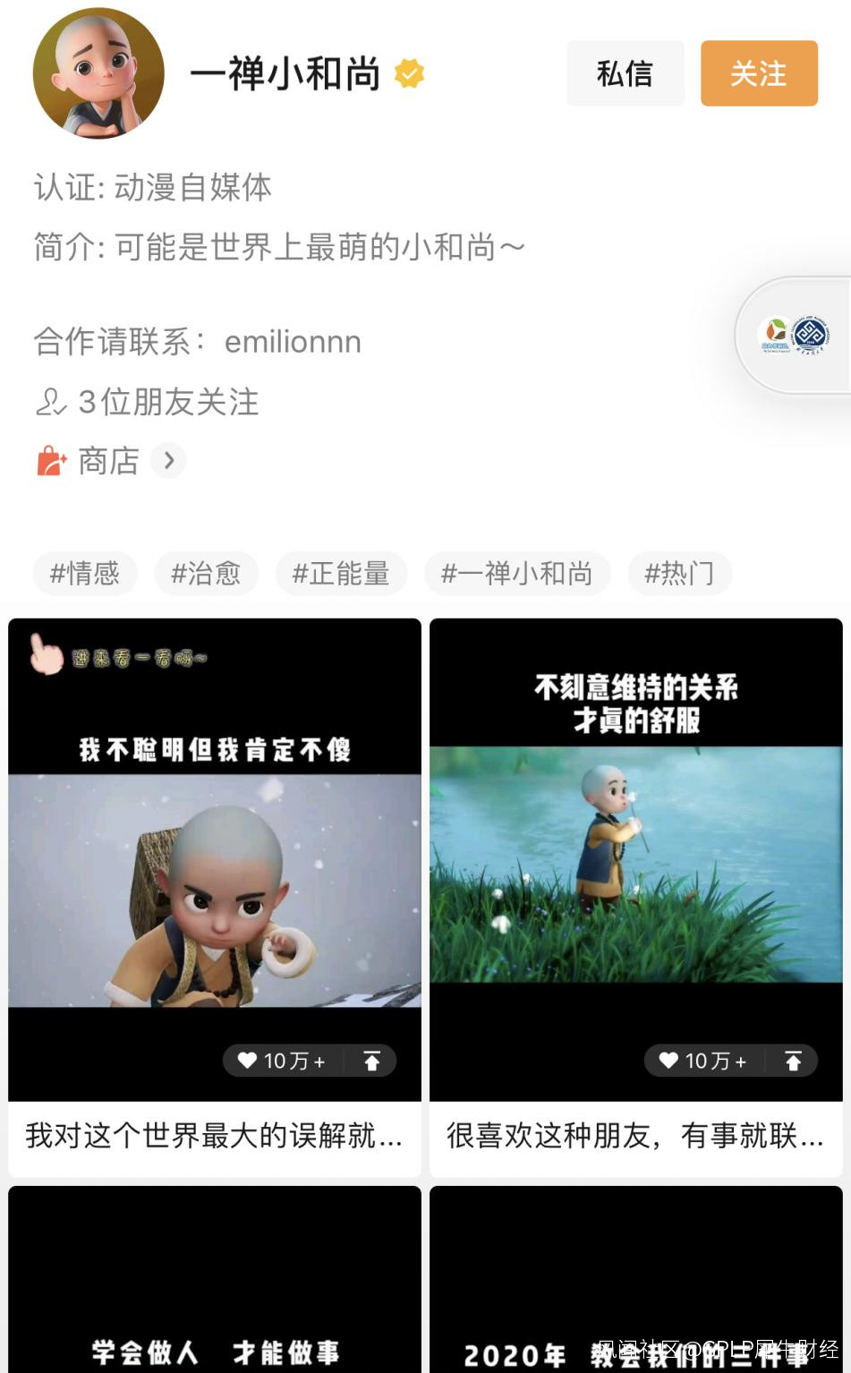 同時,在視頻號誕生之初就迅速湧入了大批微信的“既得利益者”,如:一禪小和尚(MCN機構大禹網絡旗下賬號)、夜聽劉筱(“夜聽”創始人)、十點林少和1000本書(“十點讀書”創始人)、私域肖廠長(星辰教育創始人)等。目前,一禪小和尚首頁最上面的兩條視頻單條點贊均在10萬+。