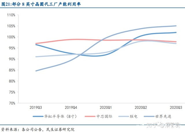 具體到汽車芯片領域,問題就更嚴重一些。車用芯片,特別是其核心MCU,大多為28nm製程以上,使用較為老舊的8英寸晶圓,歸類上屬於成熟製程一類,並不是投資的核心。自2019下半年以來,8英寸晶圓產能就已經很緊張。根據資料顯示,世界先進、華虹宏力在2020Q3的8英寸晶圓廠產能利用率均超過 100%,聯電,中芯國際的8英寸晶圓廠產能利用率也處在 95%的高位附近。
