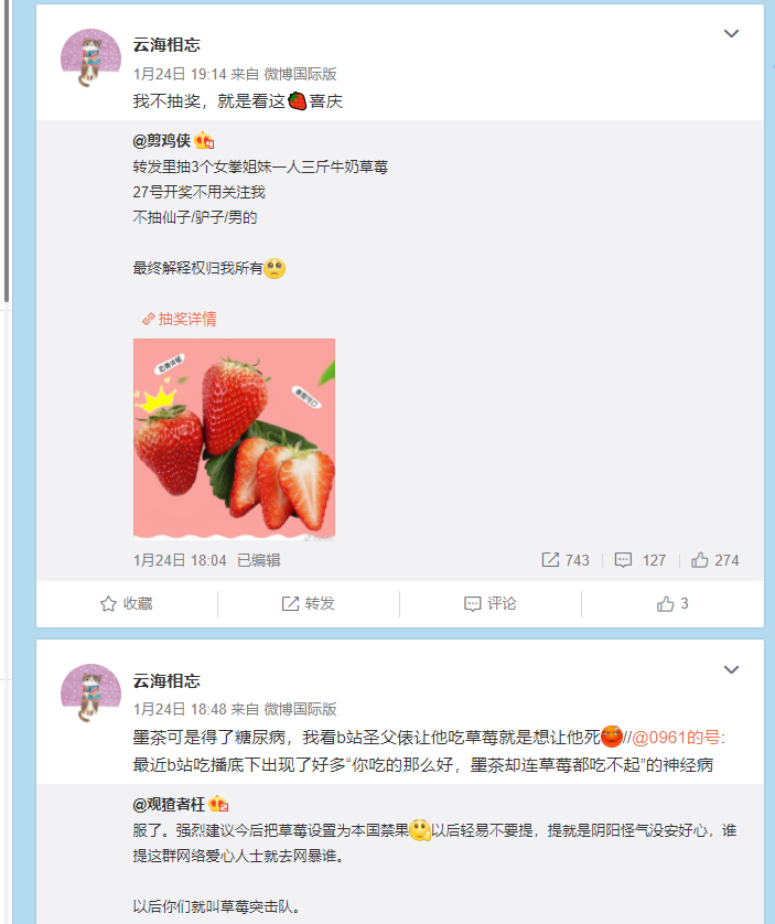 接着就是轉發抱團的辱罵狂歡,甚至還有博主表示要抽三個姐妹送草莓,就為了慶祝墨茶的悲慘去世。