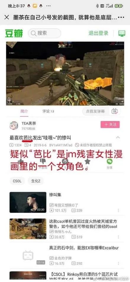 她們説“墨茶辱女,死有餘辜”,證據居然是另一個疑似墨茶小號的B站賬號,發了一個視頻,標題是“最喜歡芭比發出哇哦的慘叫。”: