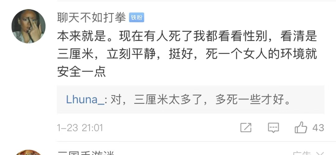 激進一點的,則認為男性死得越多越好,男性死得越多,女人的環境就安全一點: