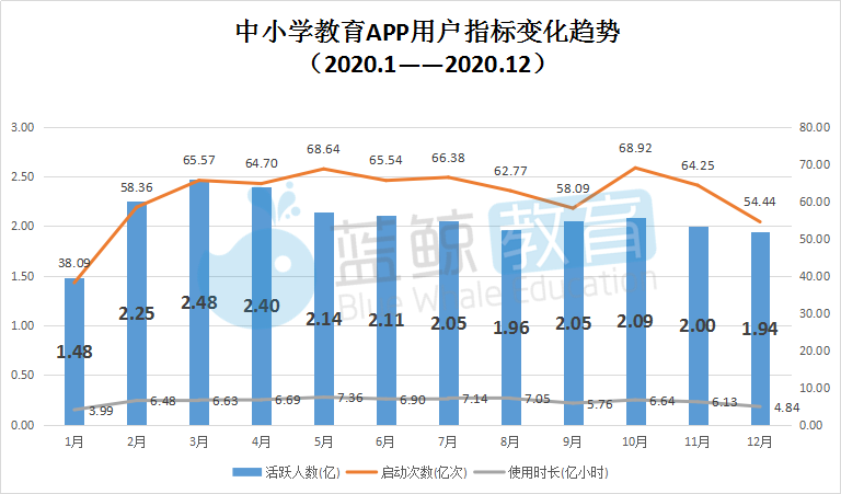 總體來看,中小學教育賽道活躍用户規模在起伏中上升,該賽道在2020年第一季度出現連續上升,在2020年3月末時達到流量頂峯,用户規模2.48億,從4月末開始出現下降,之後經過了連續多月的小幅波動。2020年12月末活躍用户接近2億次,使用時長和啓動次數在12月末均出現明顯下跌。