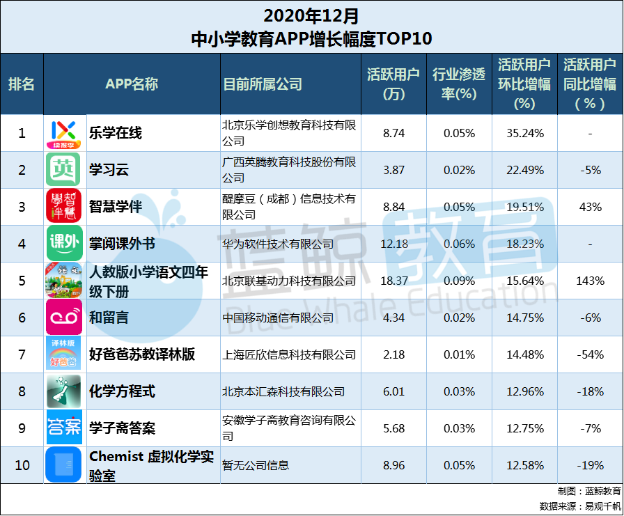 2020年12月末用户增速前十的APP分別是:“樂學在線”“學習雲”“智慧學伴”“掌閲課外書”“人教版小學語文四年級下冊”“和留言”“好爸爸蘇教譯林版”“化學方程式”“學子齋答案”“Chemist 虛擬化學實驗室”。
