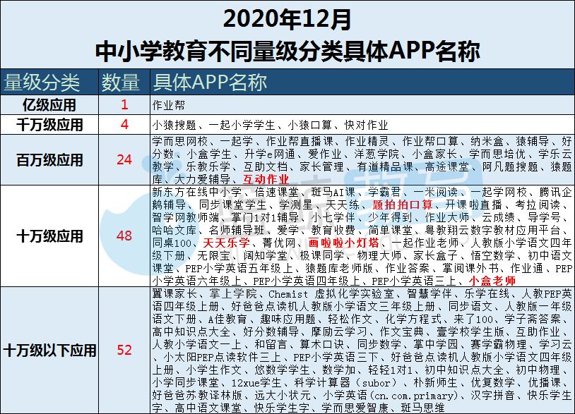 從該榜可以看出,億級應用與千萬級應用並未發生變化;百萬級新增的應用是“互動作業”(上圖已標紅);十萬級應用新增四家企業,分別是:“題拍拍口算”“天天樂學”“畫啦啦小燈塔”“小盒老師”(上圖已標紅);“掌上學院”(圖中標灰的APP)則從十萬級應用跌出,成為十萬級以下應用。