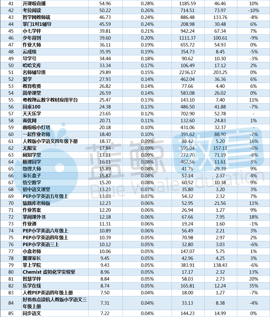 “學習雲”位列第二,漲幅為22.49%,活躍用户為3.87萬;位列第三位的“智慧學伴”月活漲幅19.51%;第四名的“掌閲課外書”漲幅18.23%;“人教版小學語文四年級下冊”漲幅15.64%,位列漲幅榜第五位。值得一提的是,“樂學在線”“智慧學伴”已連續三月登上漲幅TOP 10榜單。
