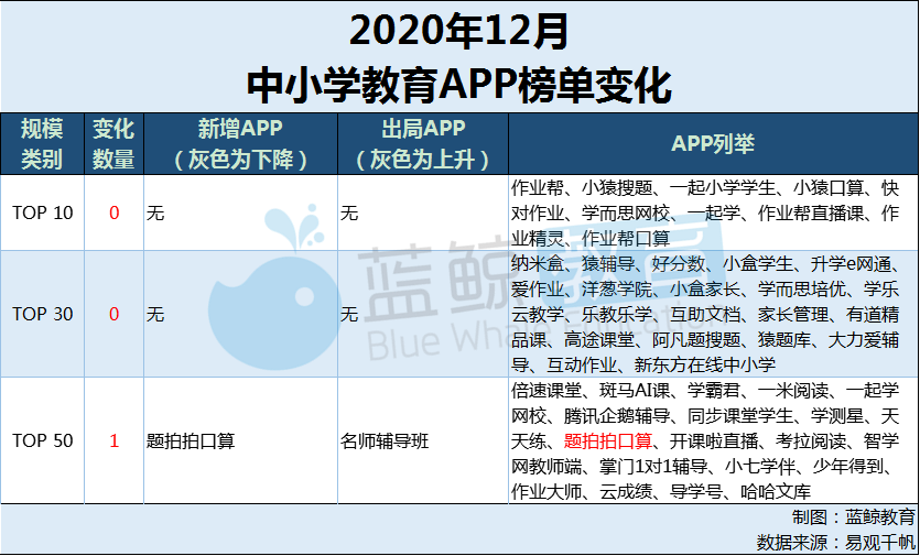 為了更好的梳理2020年12月末中小學教育學習賽道具體的APP數據變化,藍鯨教育智庫選取了2020年11月末到12月末,中小學教育APP的具體榜單變化,下圖是“2020年12月中小學教育APP榜單變化”:標灰色的APP表示從上一級別甩出到下一級別或者從下一級別進入上一級別,並不算作該級別新增APP;標紅的為2020年12月各大TOP排行榜等級上升的APP: