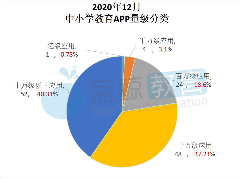 藍鯨教育智庫把129家中小學教育APP,按照用户規模,分別以1億、1000萬、100萬、10萬為界限做量級分類,得到的結果如下圖所示: