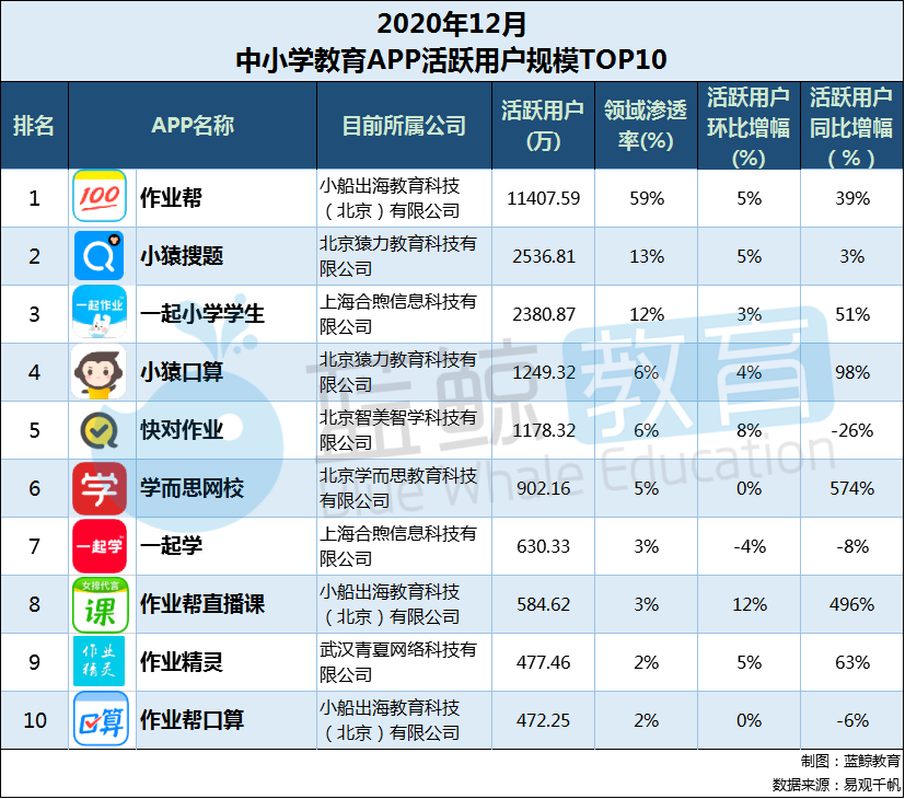 我們再來看看中小學教育領域用户增長幅度TOP 10的APP,2020年12月末活躍用户環比增幅TOP 10榜單如下(個別APP無2019年同期數據,故標為“-”):