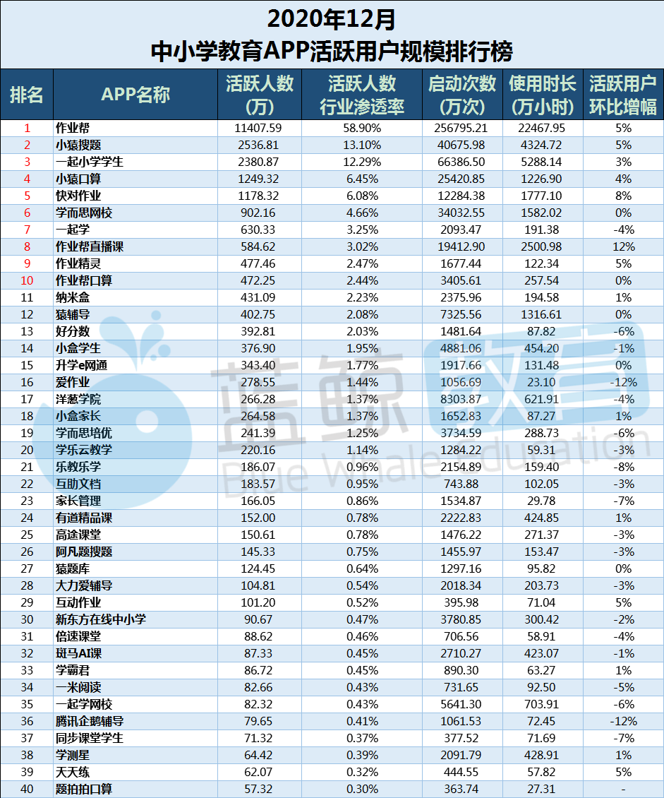 成為第四名的企業是“小猿口算”,月活躍用户1249.32萬,環比上漲4%。排名第五的“快對作業”在2020年12月末環比上漲8%,月活躍用户達1178.32萬。