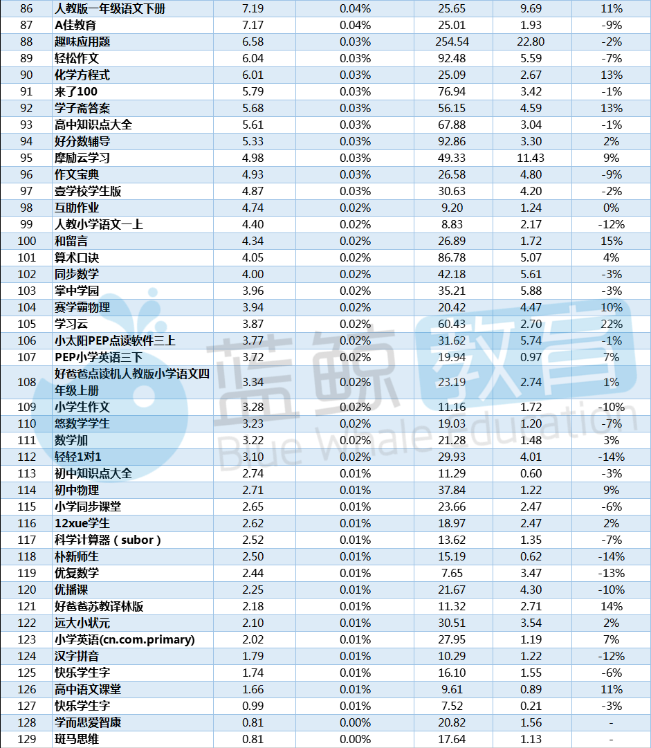 用户規模下跌比較明顯的APP有:“樸新師生”用户規模較2020年11月末環比下降14%,“輕輕1對1”下降14%,“優複數學”下降13%,“騰訊企鵝輔導”下降12%,“漢字拼音”下降12%,“愛作業”下降12%,“人教小學語文一上”也下降12%……