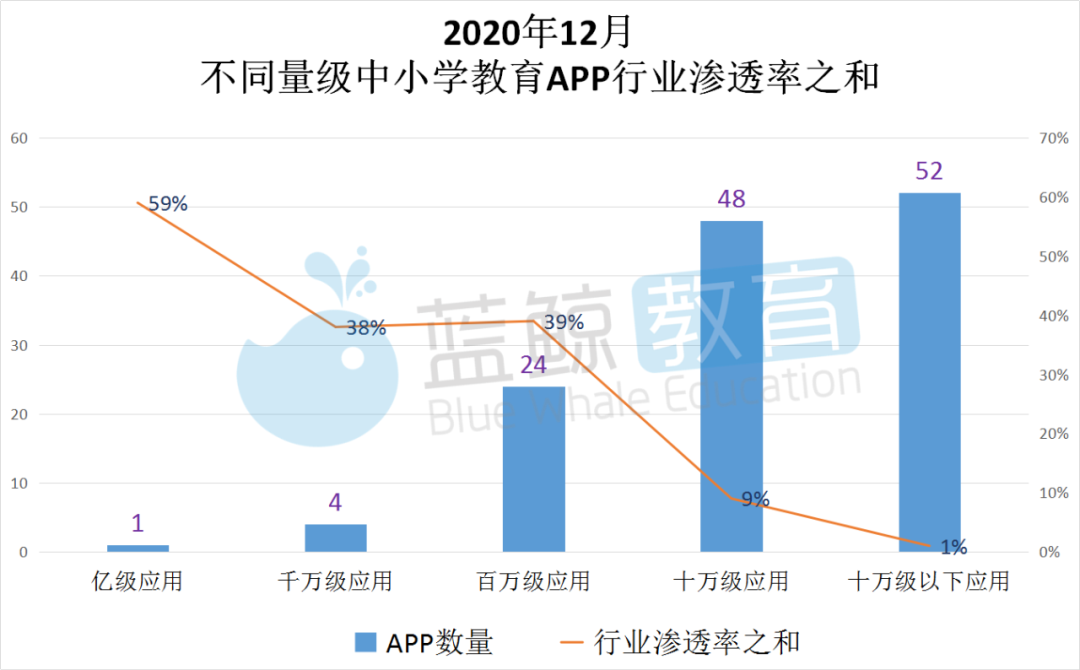 所有活躍的中小學教育APP中,用户規模過億的APP依然只有一家——“作業幫”,數量佔比0.78%。2020年12月末用户規模高達1.14 億,領域滲透率高達58.9%,遙遙領先於該賽道其他APP。