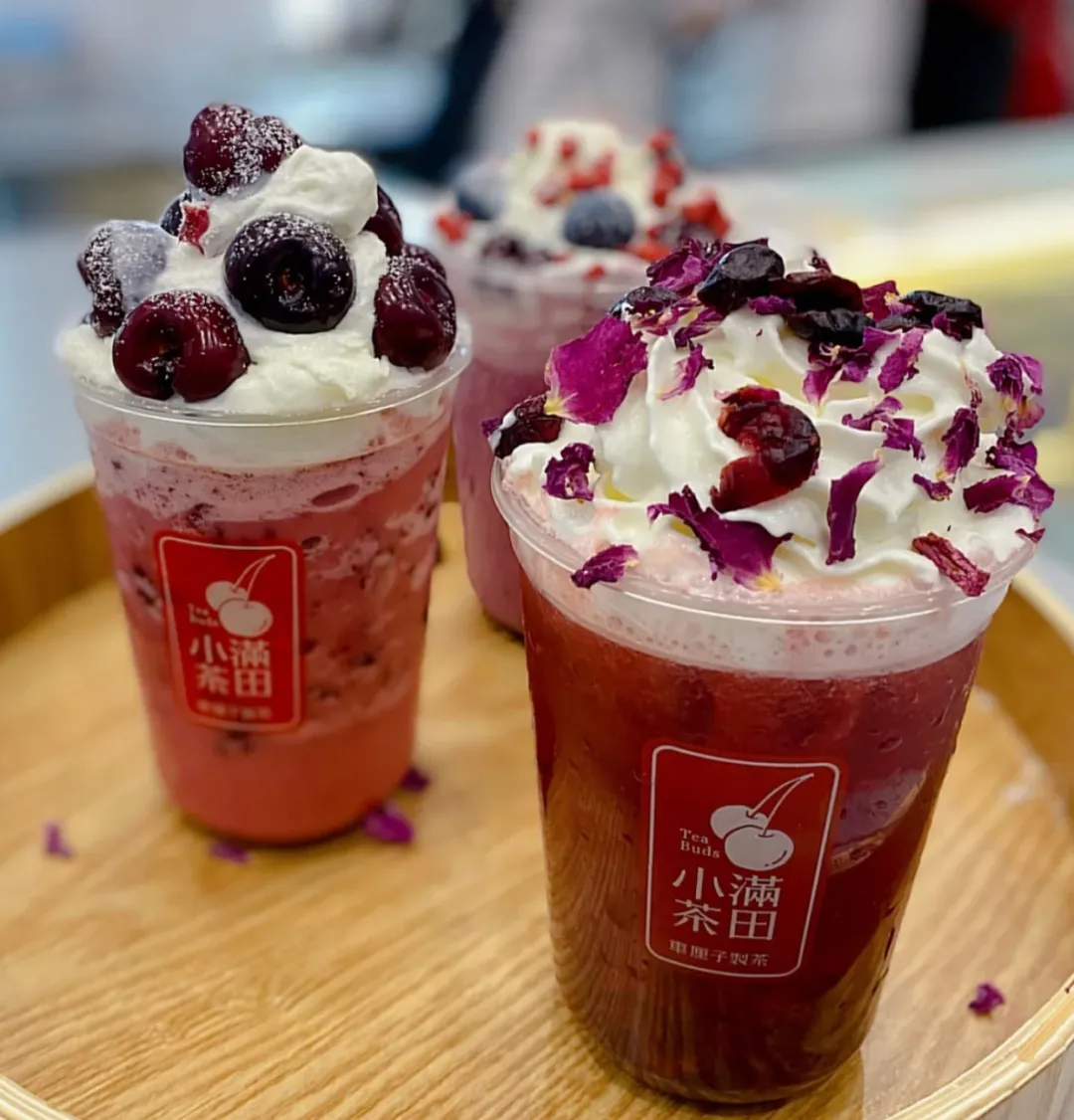 主打車釐子製茶的小滿茶田,早早地就迎來了粉絲打卡,更是採用JJJ級車釐子,就車釐子產品,就推出了車釐子炸彈、車釐子藍莓奶芙皇、車釐子玫瑰奶芙等10款產品,價格也從26元~39元/杯不等。