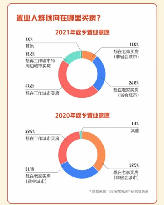 而根據58同城、安居客上一年發佈的《2019~2020年返鄉置業調查報告》,有68.6%傾向於選擇回鄉置業(包含家鄉城市及家鄉所在的省會城市),想在工作城市(非家鄉城市及家鄉省會城市)的人羣佔比為29.8%。可見,相比上一年,在工作地就近買房的比重大幅增長,返鄉買房的比重大幅降低。