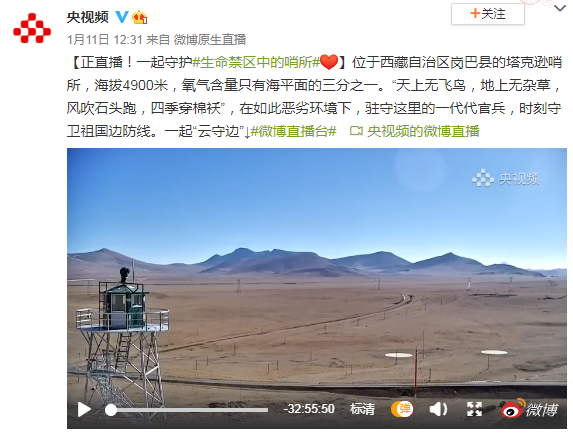 前幾天央視頻在西藏自治區崗巴縣的塔克遜哨所架設了攝像頭進行直播,讓網友能夠和士兵一起“雲守邊”,感受一下守衞邊疆的日常。
