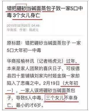 2015年,陝西一户人家,因在做飯的時候一家5口誤食“硼砂”,3個女兒(分別是13歲、9歲、6歲)不幸身亡。