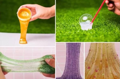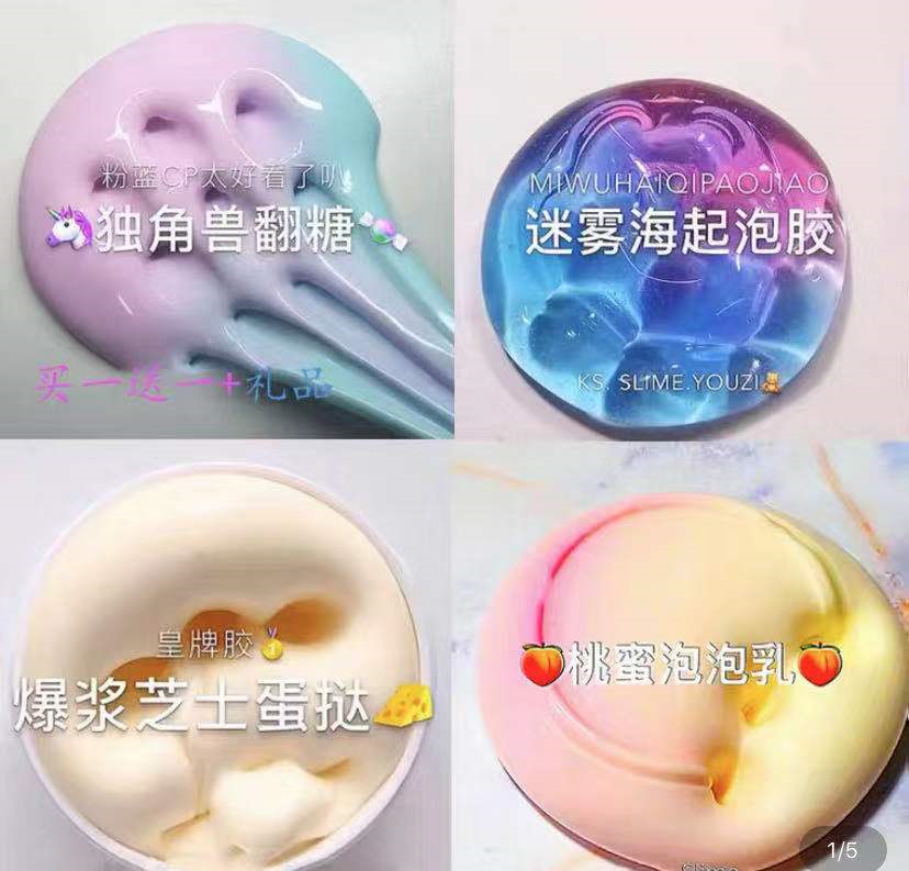 史萊姆的手感有很多:黃油,水彈,透泰,千絲,磨砂,玩法也不少:起泡膠,水晶泥,泰透,冰山,瓜爾膠,假水,珠光泥等等。