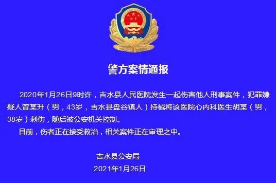 2021年1月26日9時許,吉水縣人民醫院發生一起傷害他人刑事案件,犯罪嫌疑人曾某升(男,43歲,吉水縣盤谷鎮人)持械將該醫院心內科醫生胡某(男,38歲)刺傷,隨後被公安機關控制。