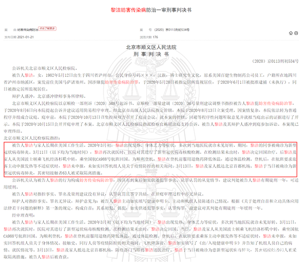 判決書顯示,黎潔,女,1982年5月12日出生於四川省瀘州市,漢族,博士研究生文化,原系美國百健生物製藥公司員工,案發前住美國馬薩諸塞州,因涉嫌犯妨害傳染病防治罪,2020年5月20日被指定居所監視居住,2020年6月1日被批准逮捕(未執行),同日被指定居所監視居住。