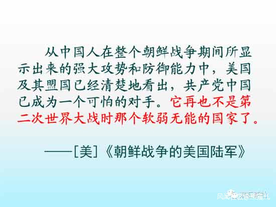 即或是中國國內,不少接受過美國教育受過美國影響的紳士階層甚至一些中高級知識分子,既或認同了中國政府出兵的正義性,也並不一定能認同這個政府和軍隊“敢打必勝”的信心,他們或許不乏民族自尊心,但卻缺乏民族自信心。在他們同樣基於過去時的認知中,美國人的個頭最高,美國人的皮膚最白,美國人的眼睛最藍,美國人頭上的月亮最圓,美國人要乾的事情誰也擋不住,美國人不讓乾的事情誰也幹不了……