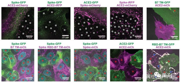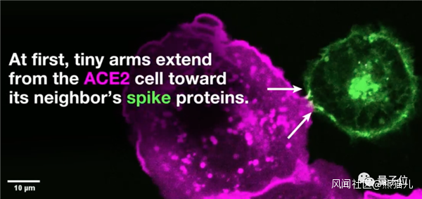 首先,他們觀察到,人體細胞(紫色)表面的ACE2蛋白,向病毒(綠色)表面的刺突蛋白伸出了微小的“觸手”。