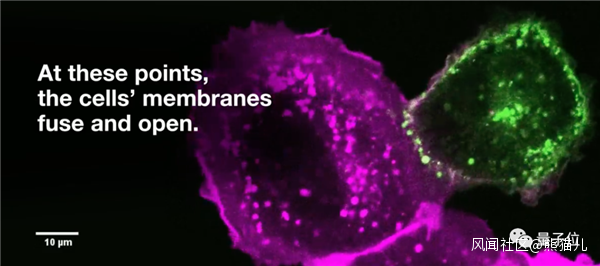 過了一段時間,兩個細胞開始融合,病毒包膜開始“融化”。
