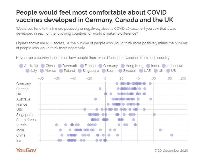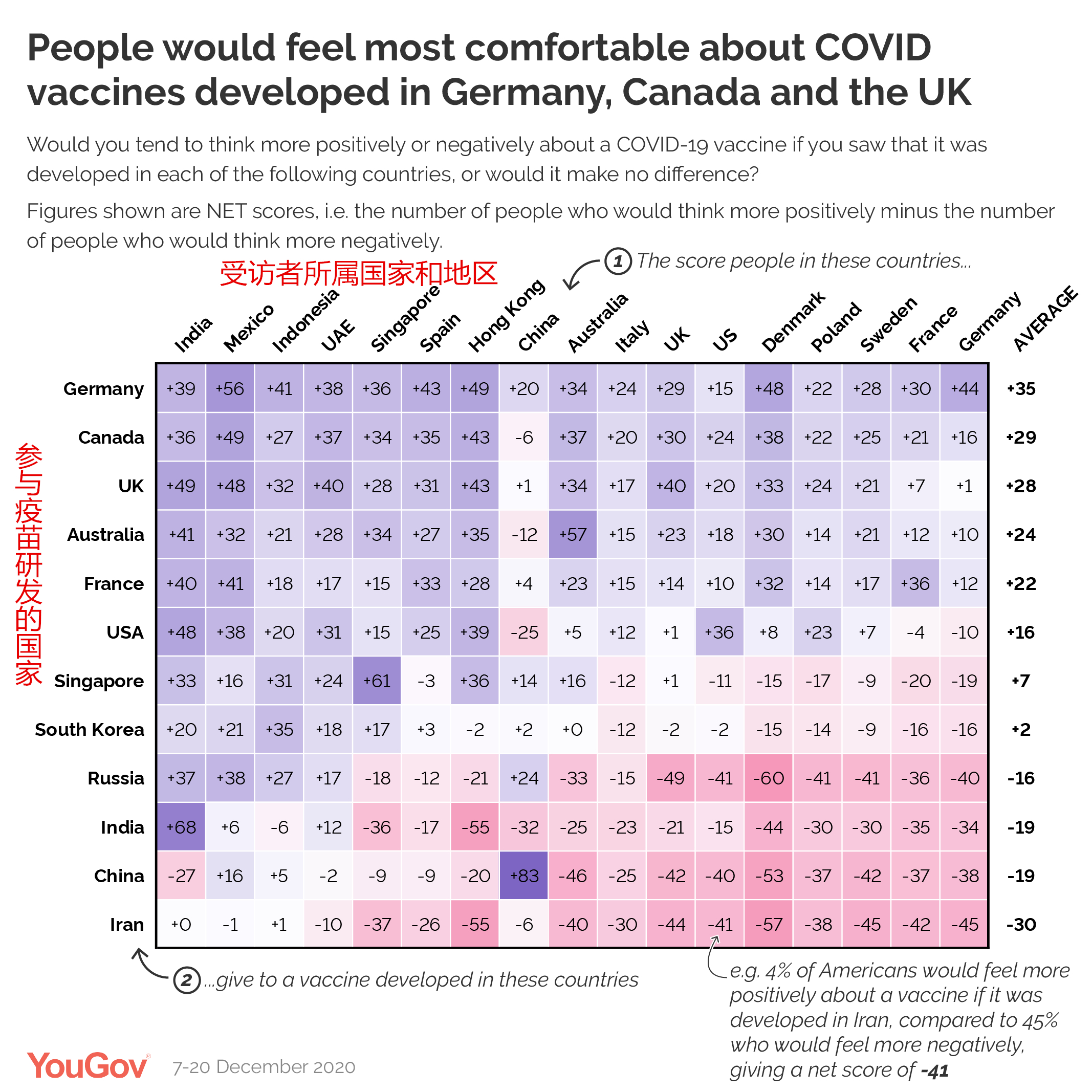 YouGov的統計對象是來自17個國家和地區的近19000人,調查進行於2020年12月,調查對象被詢問如果新冠疫苗是某個國家研發的,他們對該疫苗的看法是正面(positive)還是負面(negative)。YouGov列舉了約12個參與了新冠疫苗開發的國家。