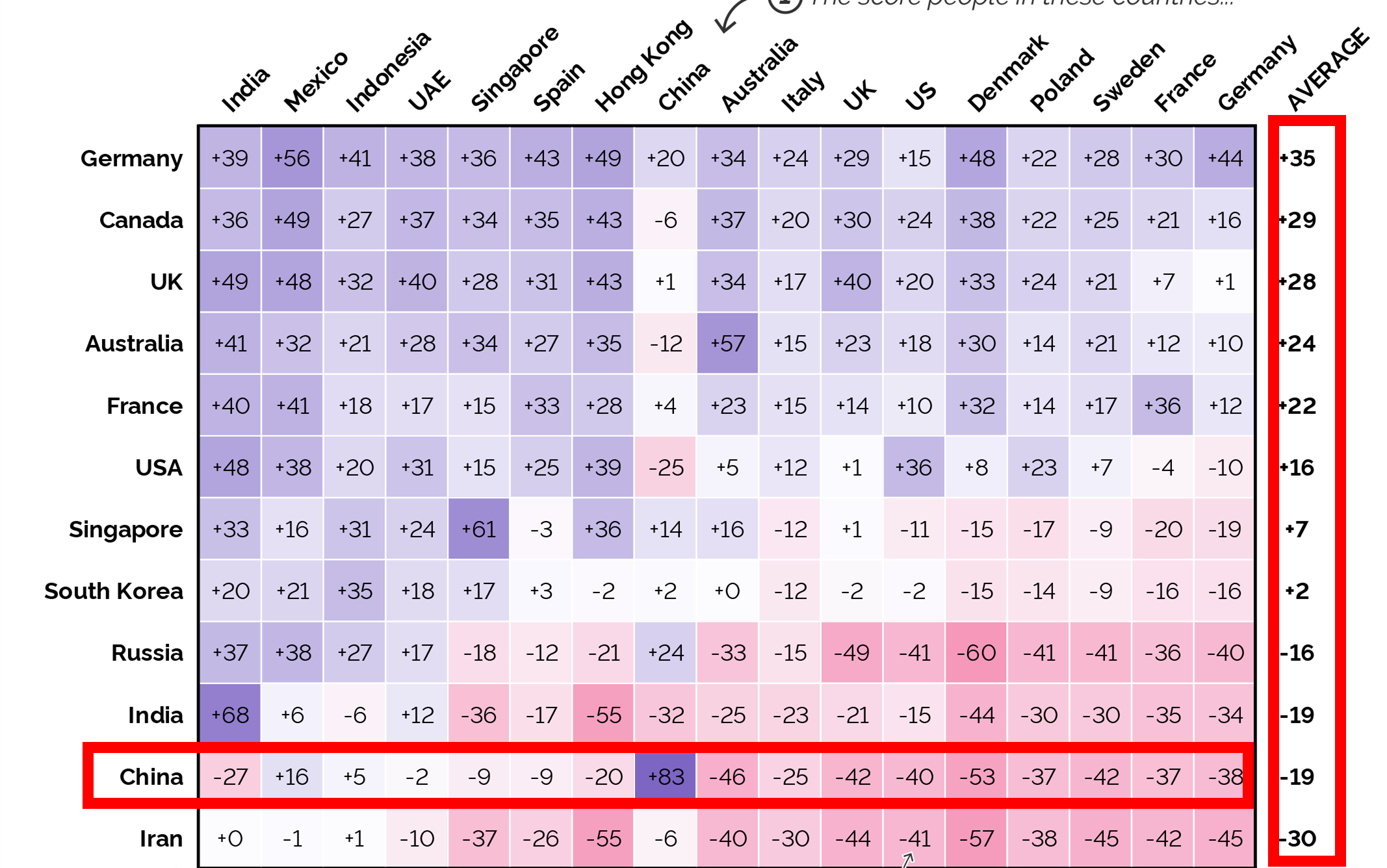 那張表格上,德國也是第一(+41),中國還是倒數(-33)。看來,在刻板印象上,他們從未變過。