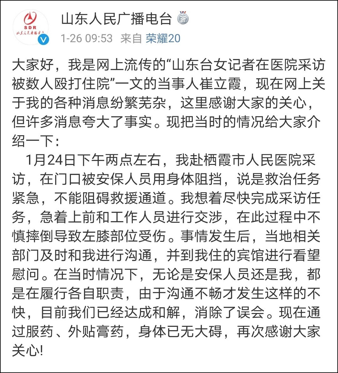 1月26日上午,@山東人民廣播電台 微博發佈記者回應,稱許多消息誇大了事實。