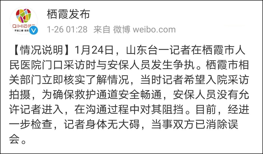 1月24日,山東台一記者在棲霞市人民醫院門口採訪時與安保人員發生爭執。棲霞市相關部門立即核實瞭解情況,當時記者希望入院採訪拍攝,為確保救護通道安全暢通,安保人員沒有允許記者進入,在溝通過程中對其阻擋。目前,經進一步檢查,記者身體無大礙,當事雙方已消除誤會。