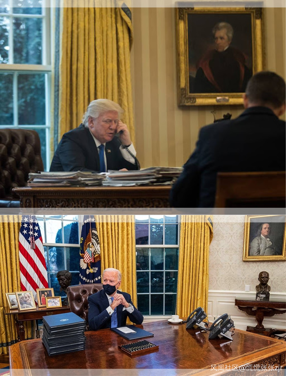 同樣的牆面,特朗普喜歡的美國第七任總統,綽號“印第安人殺手”的安德魯傑克遜的掛畫,已被拜登換成美國的開國元勳富蘭克林。