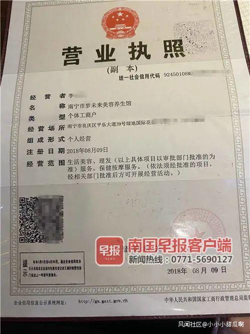 南寧市夢未來美容養生館出示的營業執照顯示,其經營範圍為生活美容、美髮按摩等。