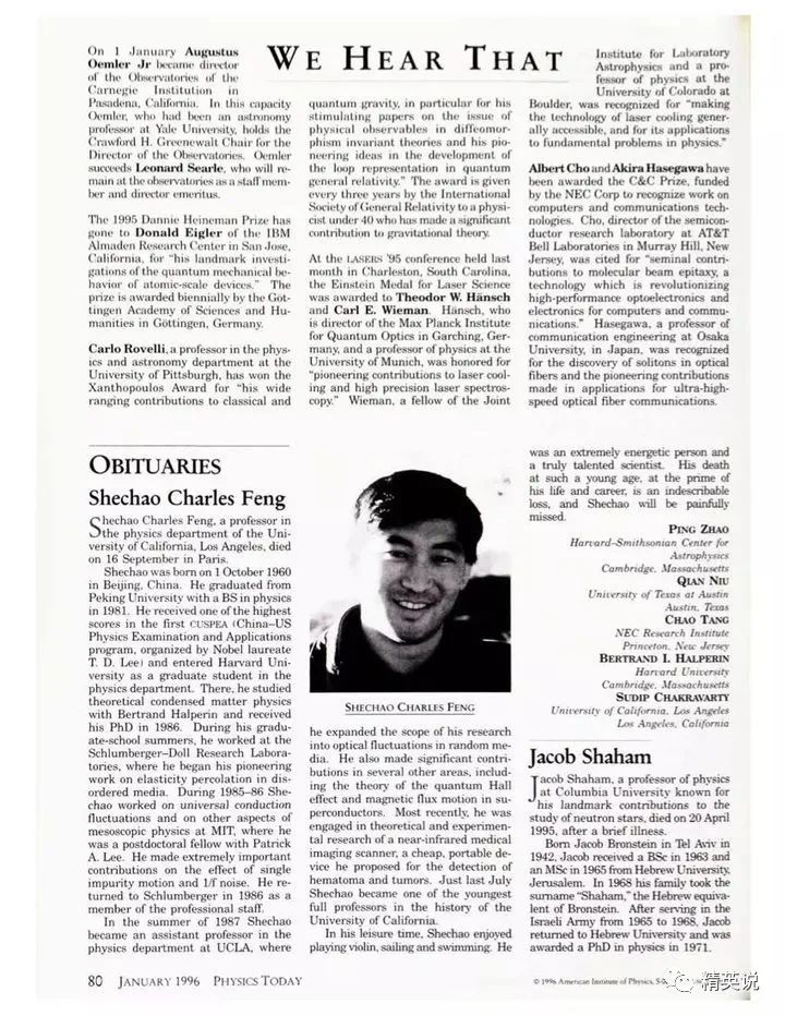 數月後,美國物理聯合會(American Institute of Physics)在它的知名月刊《今日物理》(Physics Today)1996年第一期上特地為他刊登訃告,並附上了一張黑白照片,以示重視。