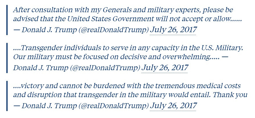 前國防部長阿什·卡特(Ash Carter)宣佈了將允許變性人於2016年在美軍中公開服役的政策。但是,在2017年7月,懂王發佈了一系列推文,以醫療費用高昂為由,立即禁止了該政策。這些推文使五角大樓的官員蒙上了陰影,其中包括懂王的第一任國防部長詹姆斯·馬蒂斯。