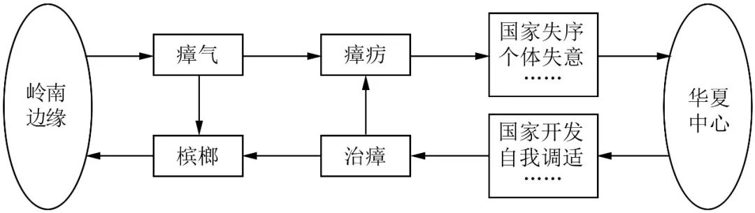 “嶺南瘴毒”的説法興於隋代巢元方《諸病源候論》,“此病生於嶺南,帶山瘴之氣,其狀發寒熱,休作有時,皆由山溪源嶺嶂濕毒氣故也,其病重於傷暑之瘧”24。雖然直至唐初,檳榔與“瘴”仍無關聯,如唐官修《本草》記載,其藥效主要為“消谷、逐水、除痰癖、殺三蟲、去伏屍、療寸白”25。但隨着中央政權加速開發嶺南,如何治療瘴病、消除瘴氣恐懼成為難題。傳統中醫強調自然萬物相生相剋,而嶺南民間在長期御瘴的實踐中,“檳榔除瘴”的理念恰好為中醫治瘴提供了理論依據。因此,在唐中後期的治瘴處方中便逐漸出現了檳榔,如王燾《外台秘要》“山瘴瘧方”中“凡跋涉江山、防諸瘴癘及蠱毒等,常服木香犀角丸方(含檳榔十分)”26。劉恂《嶺表錄異》中“交州地温,不食此(檳榔)無以祛其瘴癘”27。唐末侯寧極在《藥譜》中更是將檳榔直接稱作“洗瘴丹”28,為後世形成檳榔除瘴的認知奠定了基礎。