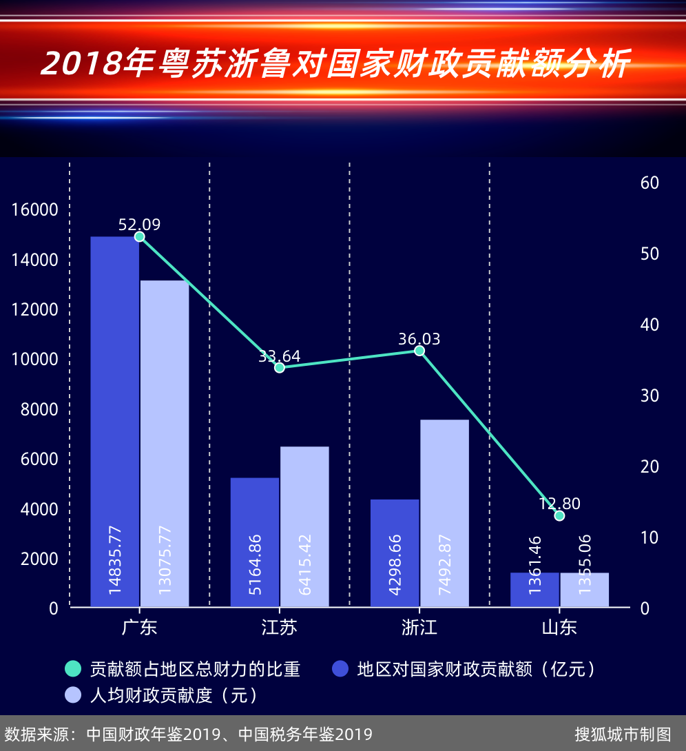 中國是典型的分税制。根據搜狐城市梳理的數據,2018年,廣東創造的總財力高達2.8萬億,而地方可支配財力只有1.36萬億,淨貢獻1.48萬億,分別是同期江蘇、浙江、山東三省的2.04、1.75、9.65倍。