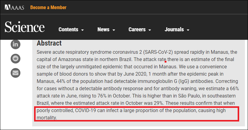 根據有關血清學和新冠抗體研究,巴西北部城市馬瑙斯(Manaus)約75%以上的人口感染新冠,這一比例高於印度新德里(50-60%),也高於理論上的羣體免疫閾值。但現有數據顯示,大量感染並沒有賦予該地區人羣持久的免疫力。