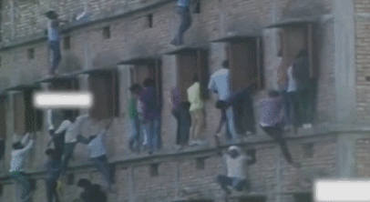 考試時,一些考生家長和朋友變身為“蜘蛛人”,攀爬到學校大樓,從窗口給考生遞小抄傳遞答案。