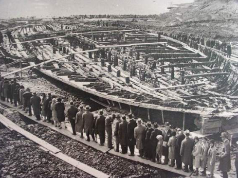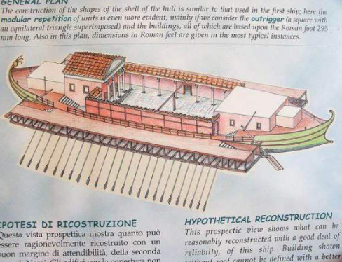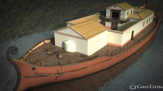 1928年10月日意大利人在距羅馬城不遠的涅米湖發現了卡里古拉的兩座古船,用了140天才將其撈出來。其中的一艘長70 米、寬17.5米 ,船上用的鐵錨重量就是1400公斤.這艘船就是卡里古拉遊玩用的,船上有青銅野獸雕像,也有各種生活措施,它就是卡里古拉的水上行宮.另一艘船上綁着青銅撞角,長度是73米,寬度是24米,用途就是建成後獻給戴安娜女神(不是神奇女俠,而是狩獵女神),因此這艘船採取了標準的羅馬貨船長寬比3比1。