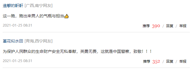 有人對警察的做法頗有微詞,認為警察不應該向罪犯跪下,有損警察身份的尊嚴。要我説警察這一跪,不是對罪犯的妥協,而是對人民生命的珍視;不是失去警察的尊嚴,而是頂天立地的壯舉!
