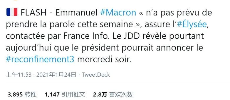 並且愛麗捨宮方面表示,封鎖決定並沒有定下來!政府會隨時關注疫情情況,來判定自1月16日以來在全法範圍內實行的18點宵禁是否有效果。如果宵禁是有效果的,那麼重新封鎖是沒有必要的,否則,必須迅速採取措施。