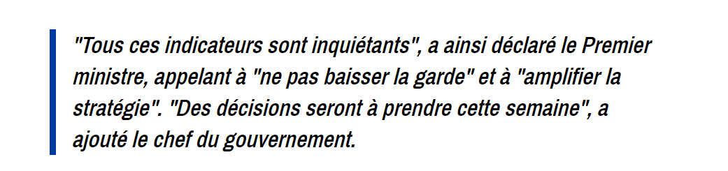 不過小編我馬上被打臉了,因為總理剛才又發話了(在小編編輯好了文章之後,他口風又變了,小編心裏苦。)他週一早上去了一趟法蘭西島的衞生局,他的口風就從文章開頭説的“希望大眾不要做出消極預期”,變成了“指標令人擔憂,呼籲不要降低警惕,本週必須作出決定”。