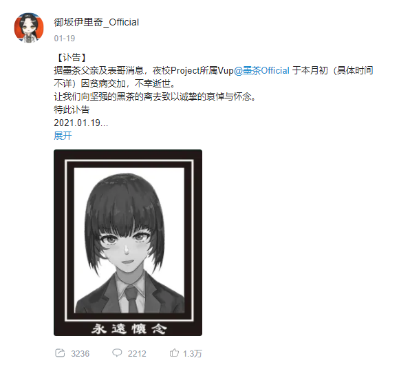 根據@御坂伊里奇_Official的説法,墨茶去世,是因為酮症酸中毒。
