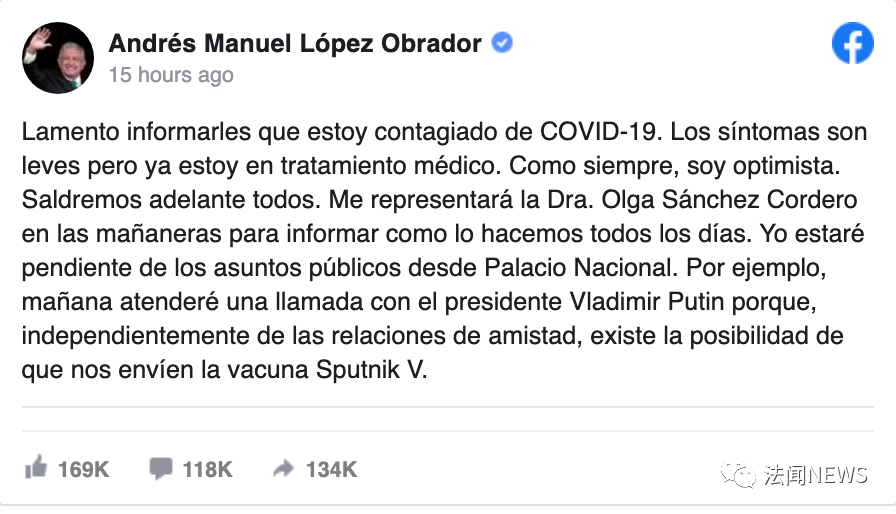 墨西哥總統Andres Manuel Lopez Obrador週日通過Facebook宣佈,他的新冠檢測呈陽性,目前症狀較輕,正在接受治療。他將在居家辦公所在地國民宮對公共事務保持關注,墨西哥內政部長Olga Sánchez將暫時代替他召開總統府週一到週五的例行新聞發佈會。