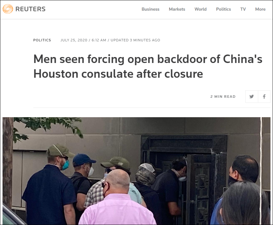 “美方人員強行闖入中國駐休斯敦領館” 路透社報道截圖